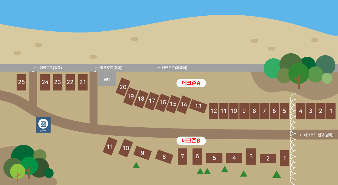 소나무숲에 조성되어 있는 데크존A(1~25번)입니다.